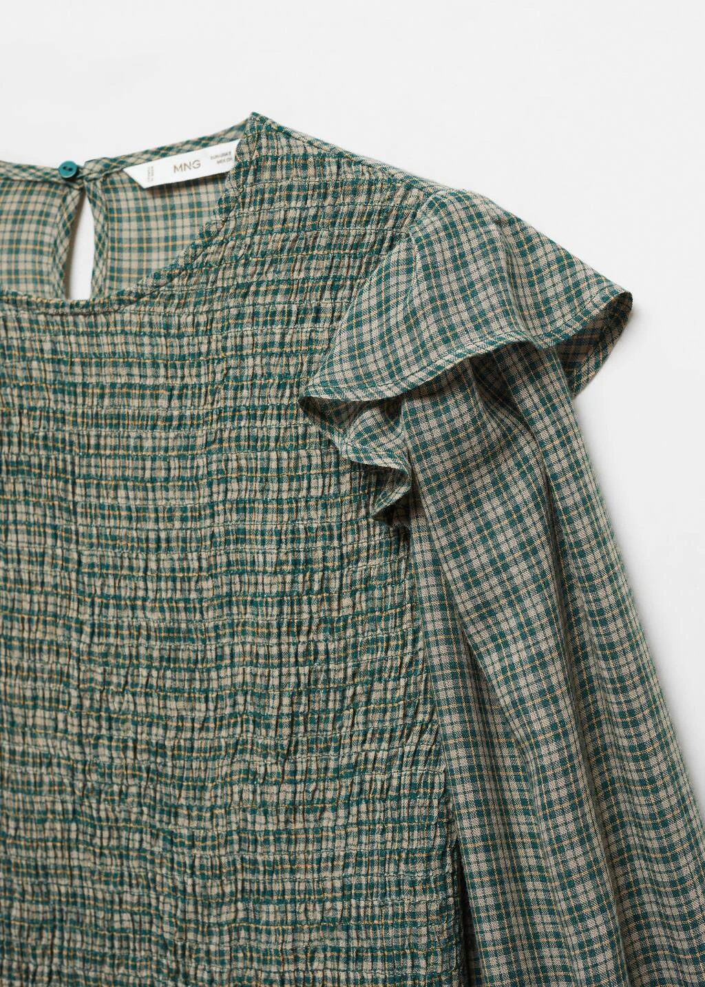 imprime carreaux, coupe droite, coupe courte, detail fronce, detail fronce aux poignets, detail de volants sur les epaules, col rond, manches longues, fermeture a boutonComposition: 83% viscose,17% acrylique