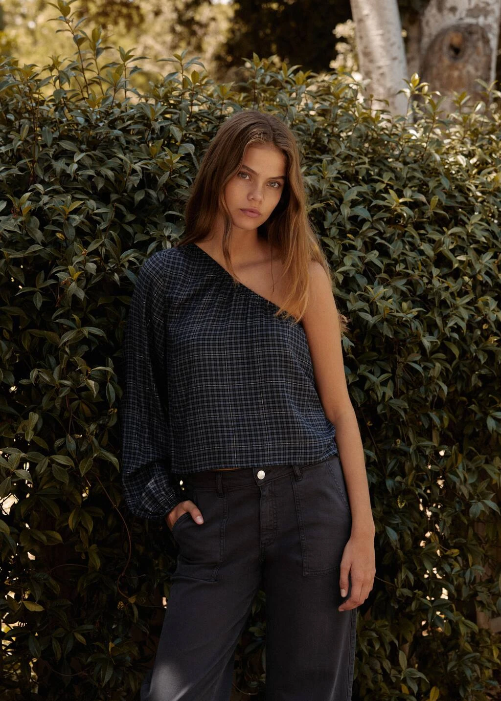 imprime carreaux, coupe asymetrique, col asymetrique, style crop, une manche, sans fermetureComposition: 99% viscose,1% metal