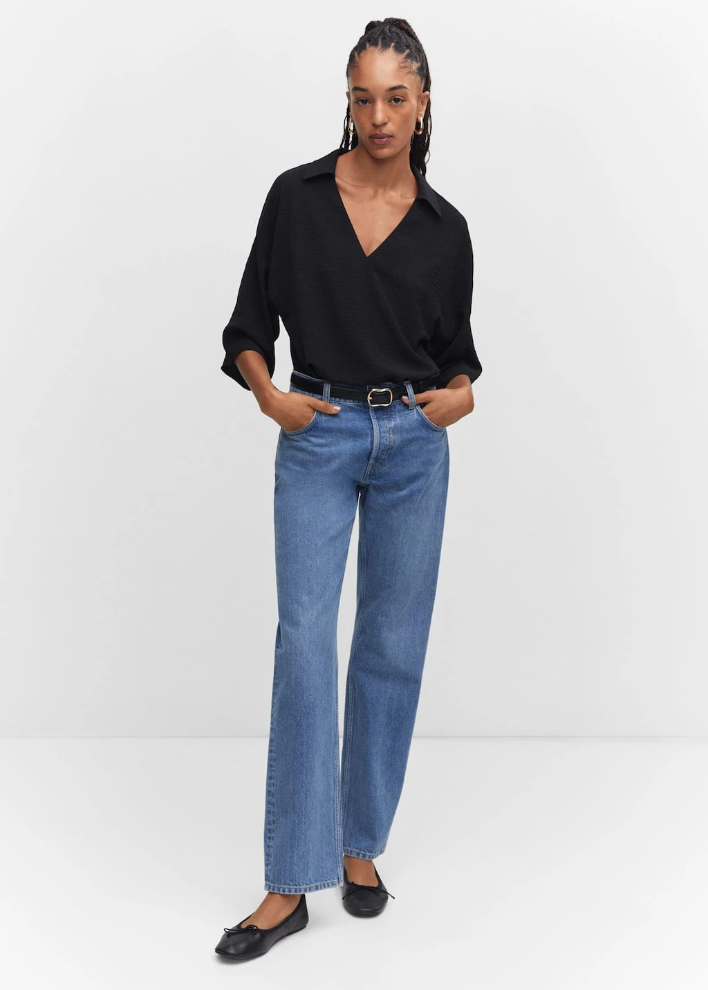 droit, coupe longue, col chemise, col en v, manches cloche trois quarts, total lookComposition: 60% polyester,40% polyester recyclé