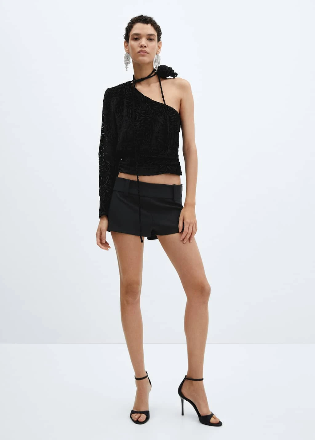 tissu en velours, coupe courte, droit, asymetrique, imprime floral, epaules denudees, manches longues, fermeture eclair invisible sur le cote, maxifleur, doublure, collection fetes et ceremonies.Composition: 65% viscose,35% polyamide. Doublure: 100% polyester