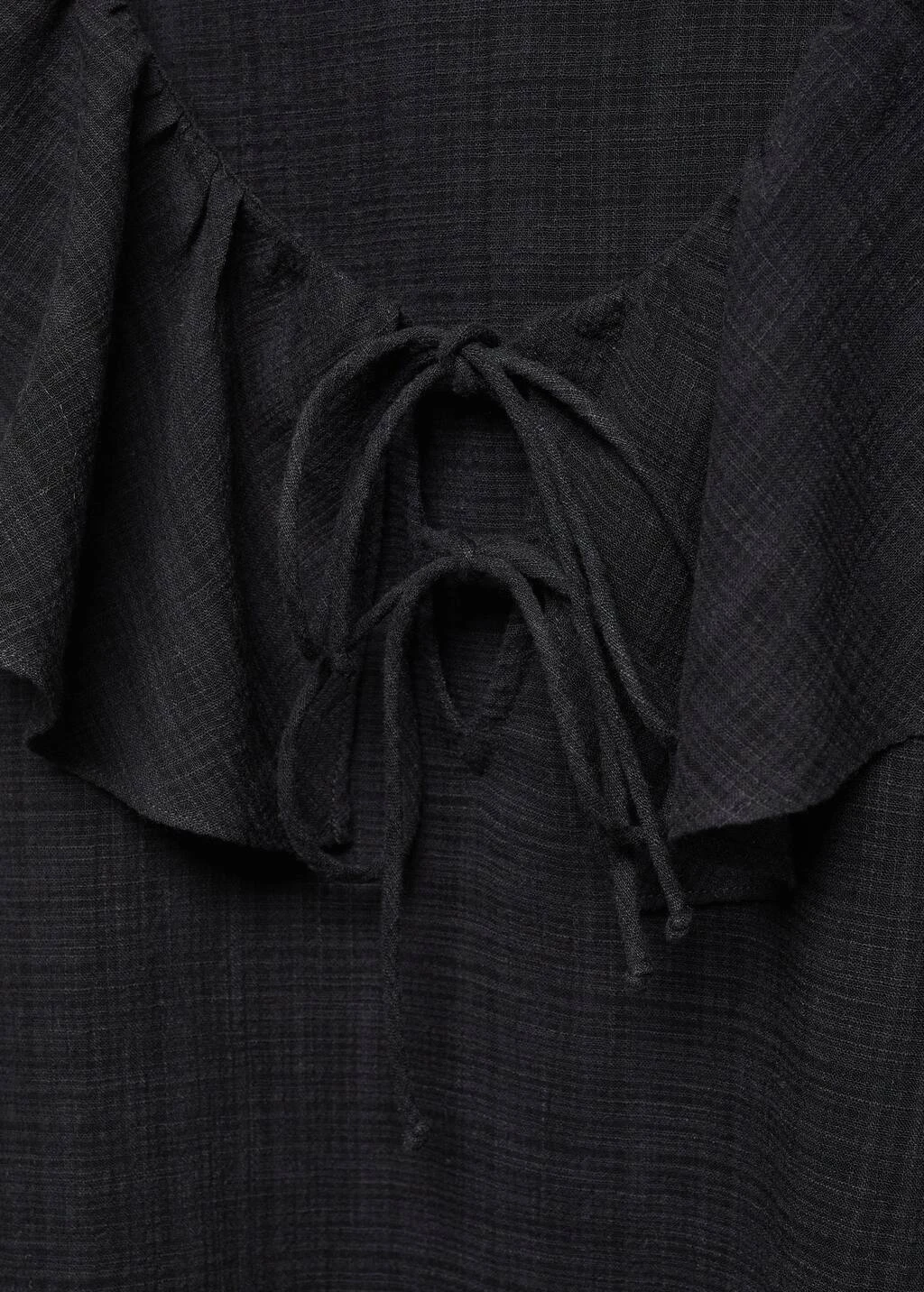 tissu en coton, coupe droite, fermeture au niveau du col, style oversize, detail fronce aux poignets, col en v, manches longues, fermeture a nouerComposition: 65% coton,35% viscose
