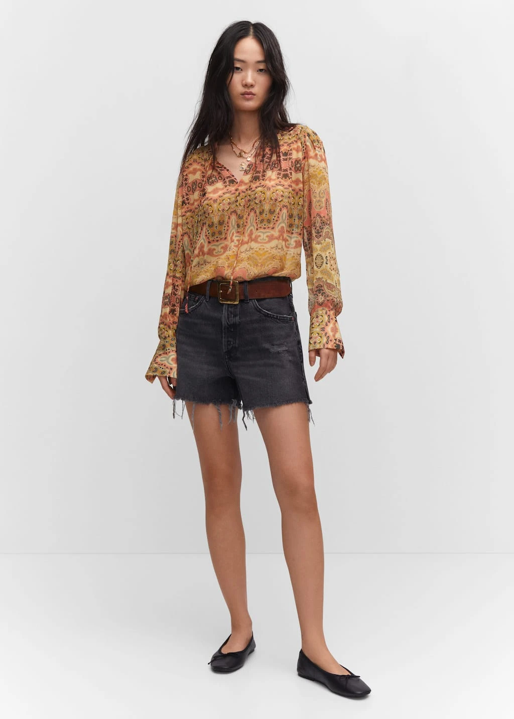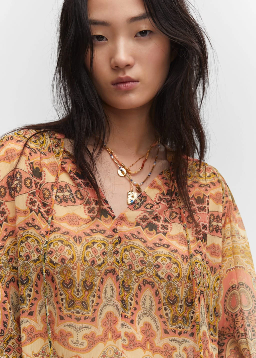 tissu fluide, droit, imprime, col rond, lien a nouer autour du cou, col en v, manches longues bouffantes, manches longues avec poignets boutonnes, style bohoComposition: 100% polyester