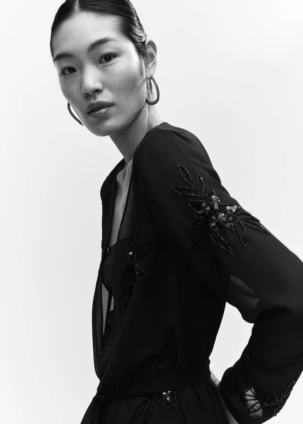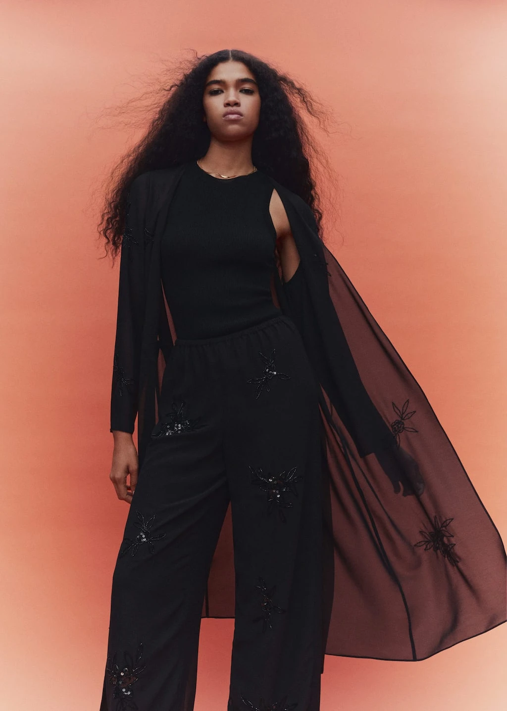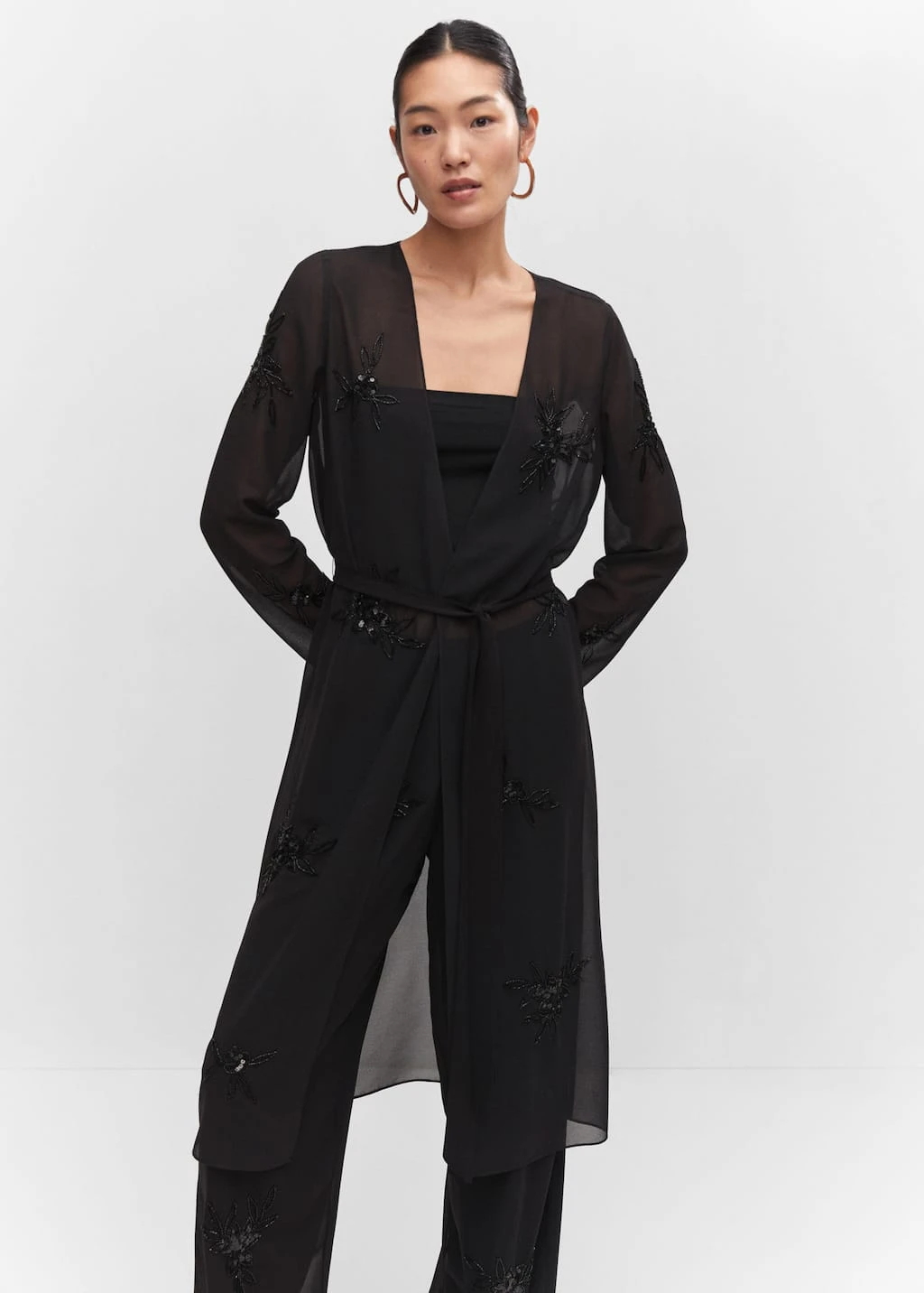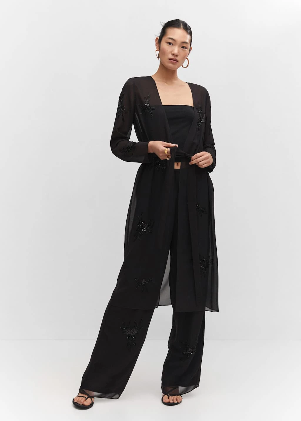 coupe droite, coupe longue, nœud a la taille, detail perle, manches longues, sans fermeture, total look, collection fetes et ceremoniesComposition: 50% polyester,50% polyester recyclé. Ornement: 100% verre. Ceinture: 50% polyester,50% polyester recyclé. Sequin: 100% polyester