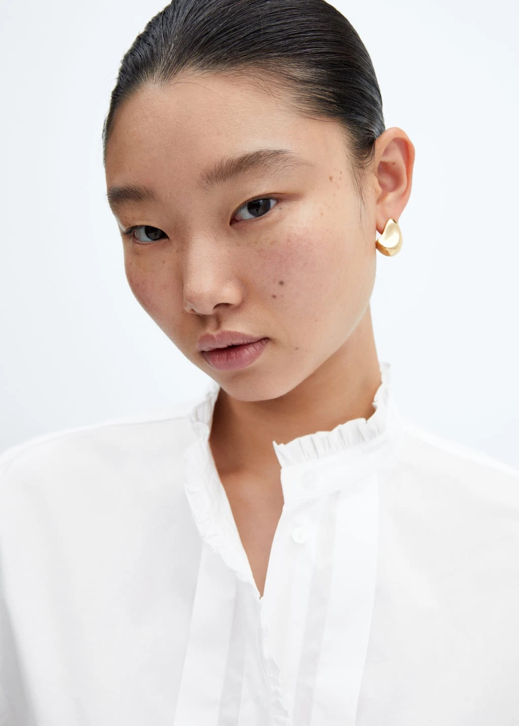 100 % coton, coupe droite, col officier, manches longues avec poignets boutonnes, fermeture a boutons dissimulee sur le devant, detail volante a l’avantComposition: 100% coton