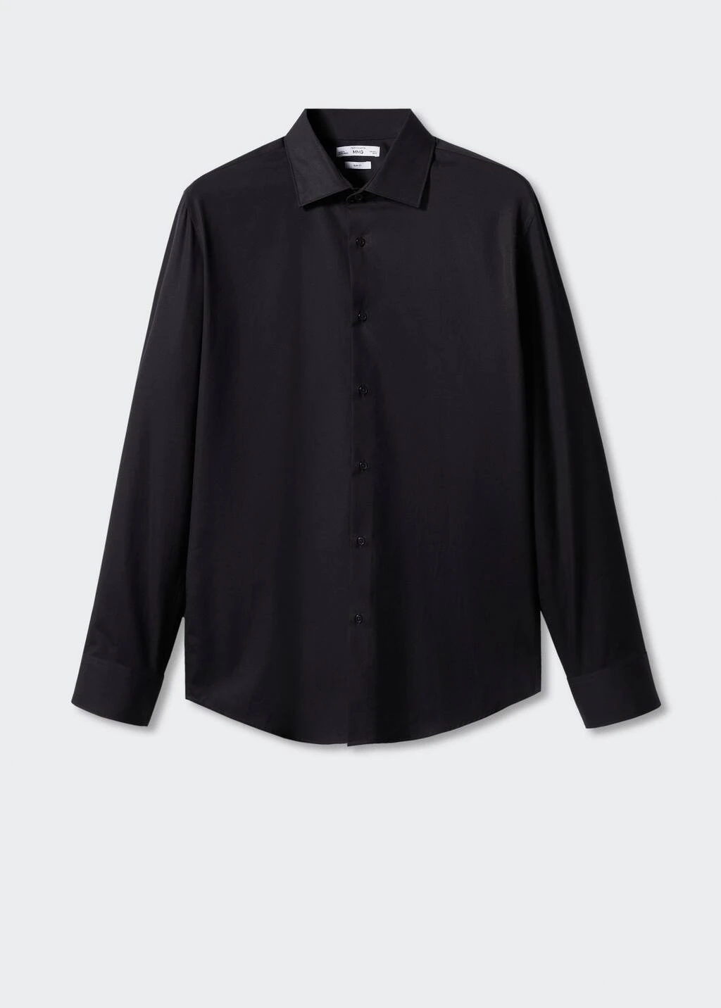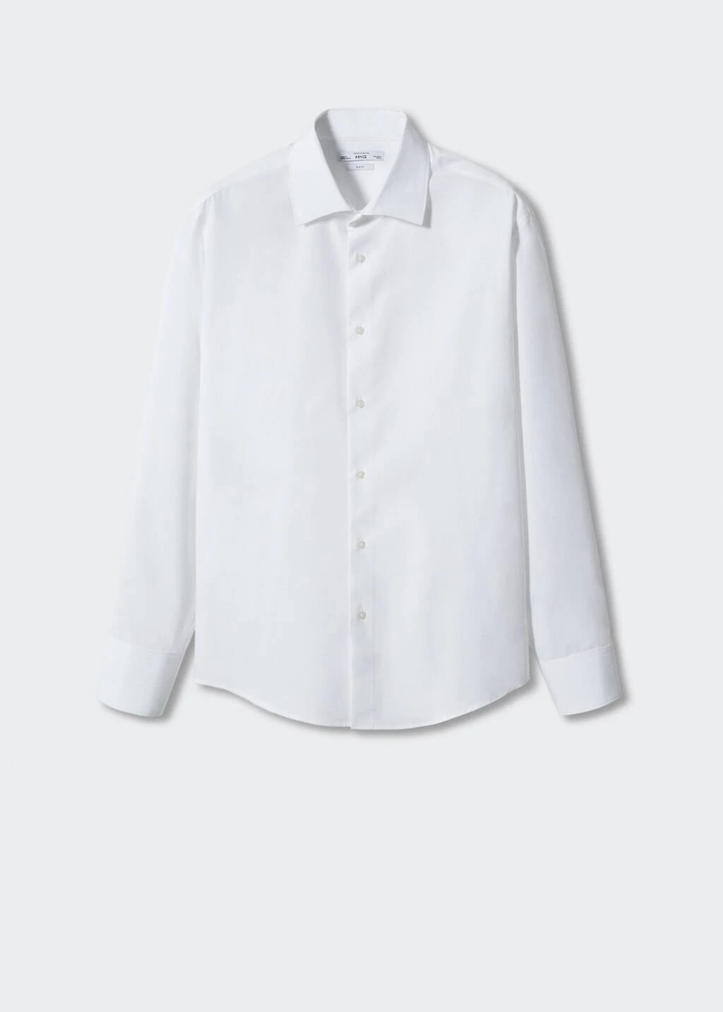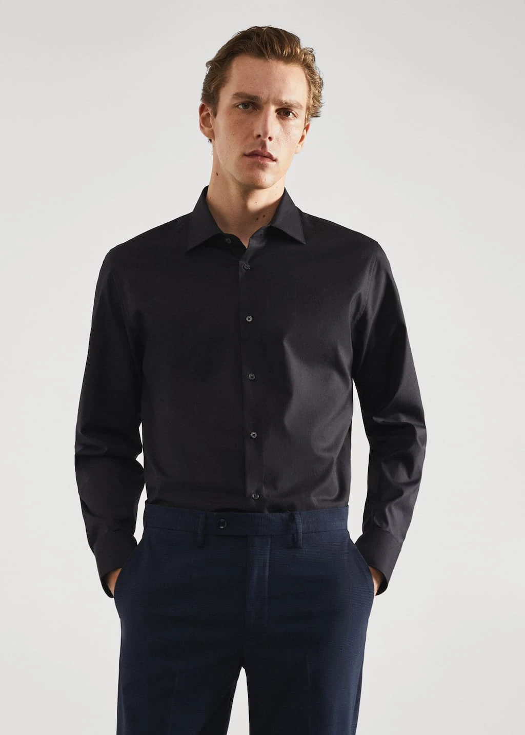 slim-fit, tissu de popeline 100 % coton, repassage facile : tissu facile a repasser, col americain, col cutaway, manches longues avec poignets boutonnes, fermeture boutonnee sur le devant, bas arrondi, le mannequin mesure 185 cm et porte une taille m, le tissu de cette chemise possede une finition particuliere, il a ete traite de facon a etre moins froisse apres le lavage et a se repasser plus facilement et efficacement. durabilite : 30/40 lavagesComposition: 100% coton
