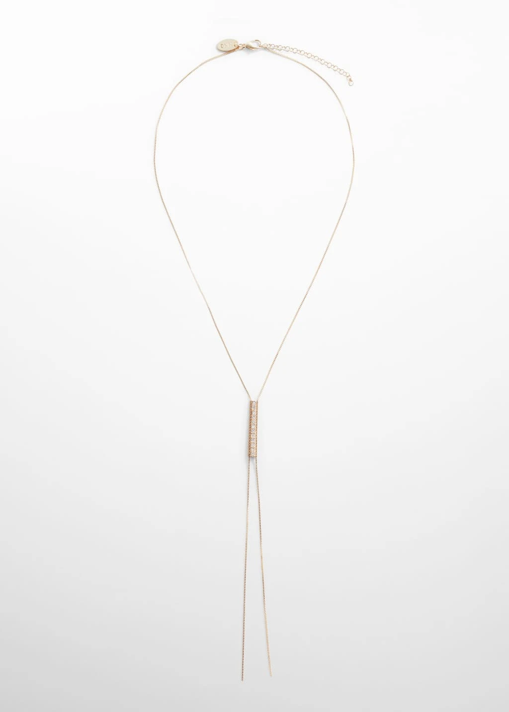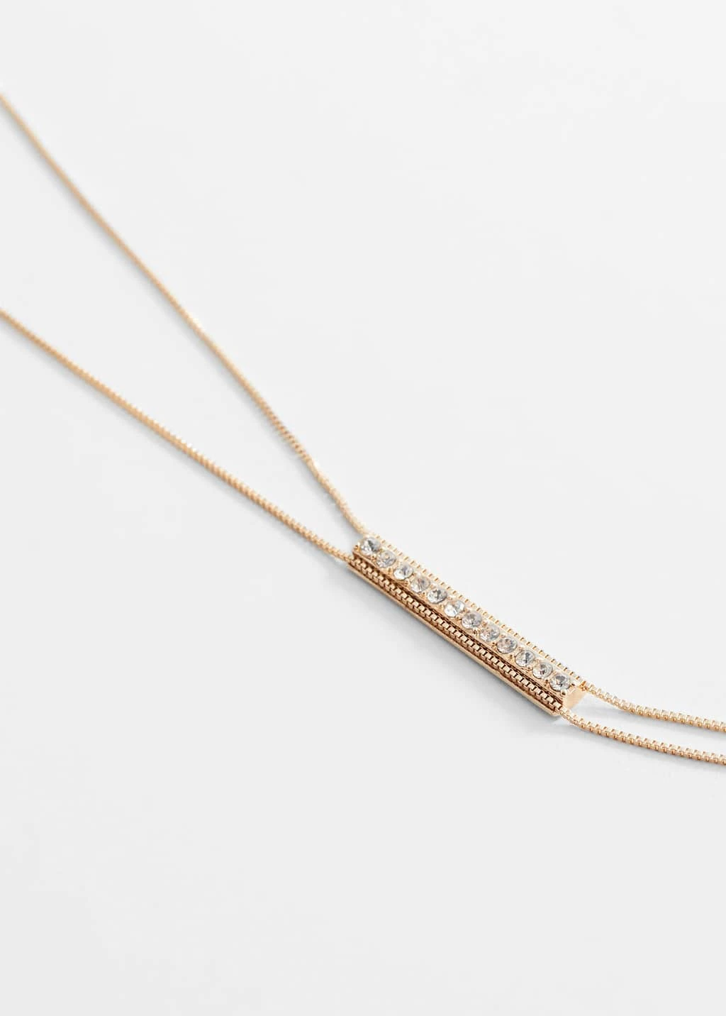 coupe longue, detail cristaux decoratifs, fermoir a chainette et mousqueton.Composition: 70% laiton,15% zinc,5% verre,5% acier inoxydable,5% plastique