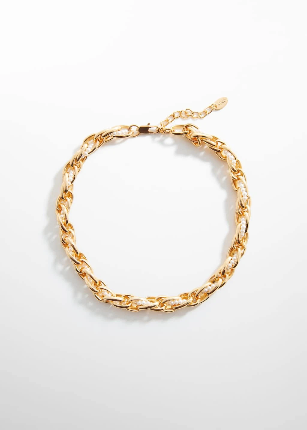 anneaux metalliques, design entrelace, ornement perle, fermoir a chainette et mousquetonComposition: 75% fer,15% acrylique,5% laiton,5% polyester