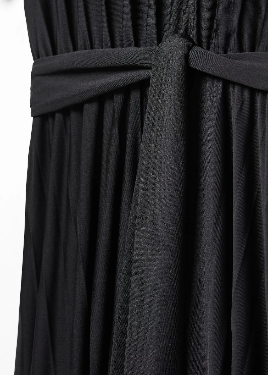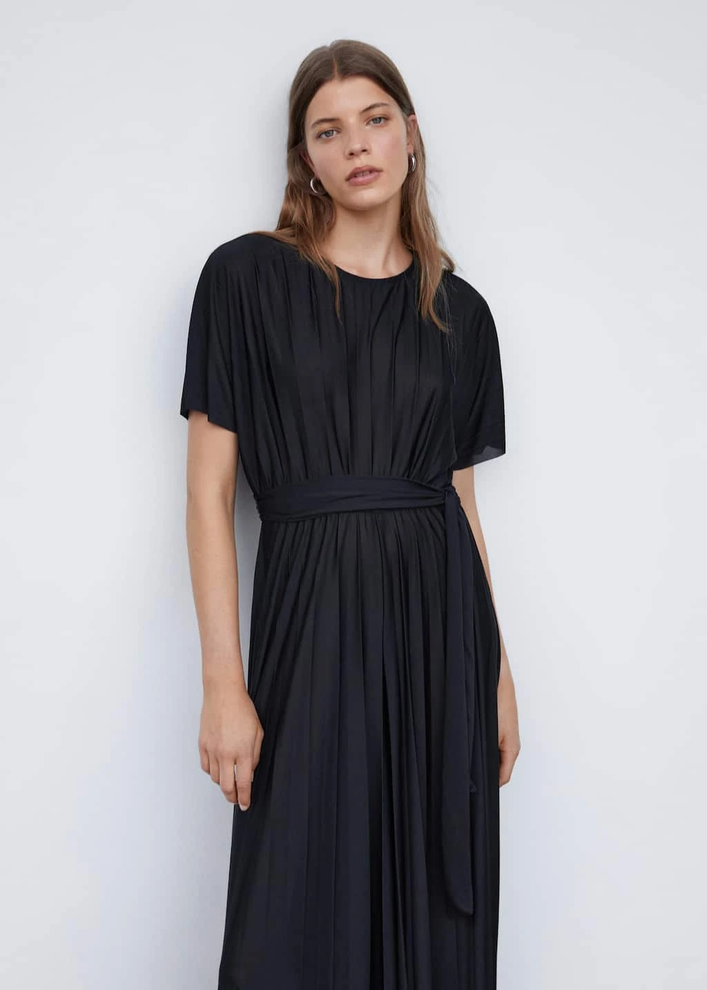 design plisse, coupe longue, col rond, manches courtes, ouverture dans le dos avec bouton, nœud a la taille, collection fetes et ceremoniesComposition: 60% polyester,40% polyester recyclé