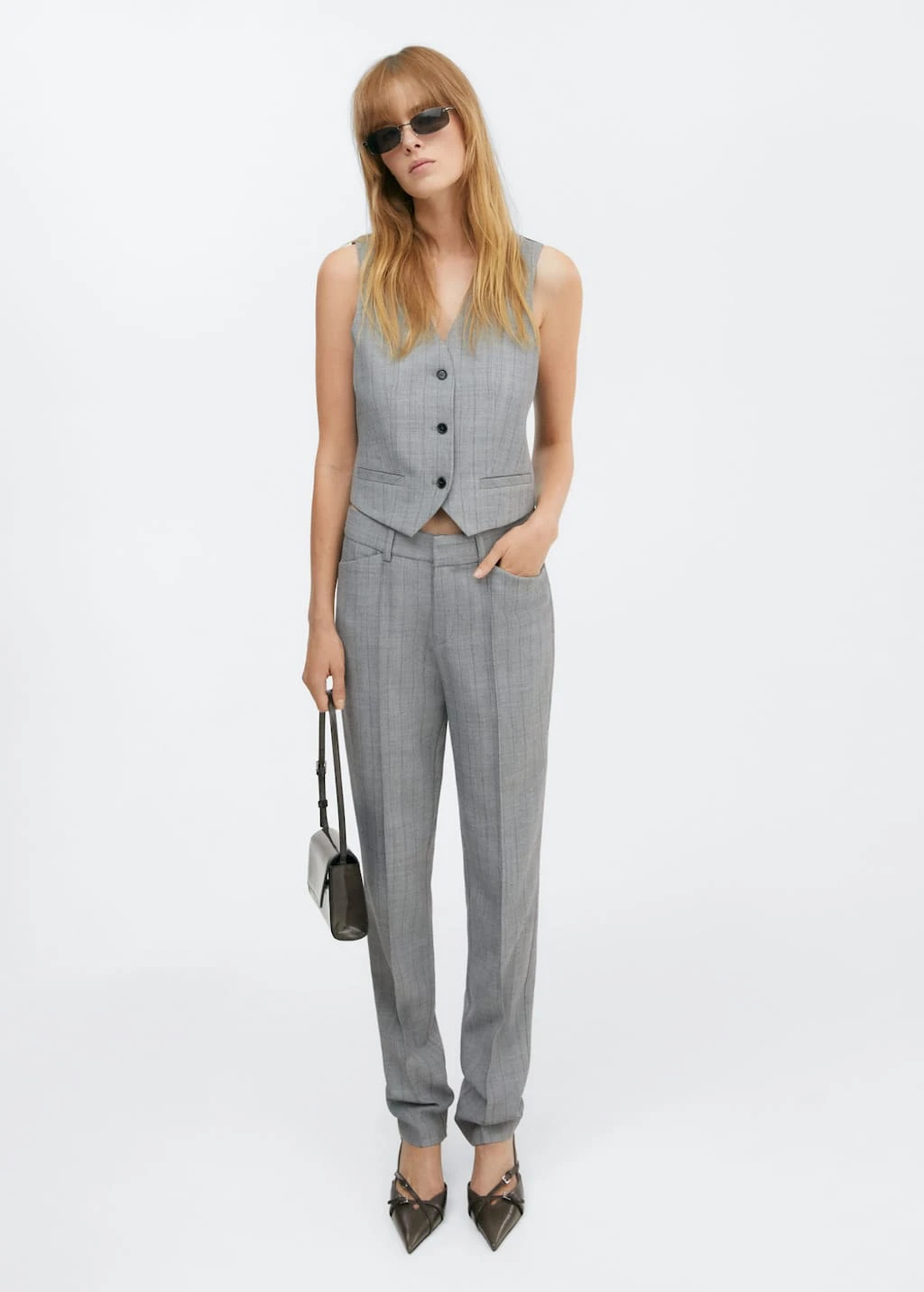 collection selection, coupe courte, imprime fines rayures, col en v, sans manches, deux poches passepoilees a l’avant, fermeture a boutons sur le devant, ruban decoratif a l’arriere, total look, une selection de pieces qui vous accompagneront lors du retour au bureau. confectionnee avec des matieres de qualite pour creer une garde-robe feminine et contemporaine pour votre quotidien.
