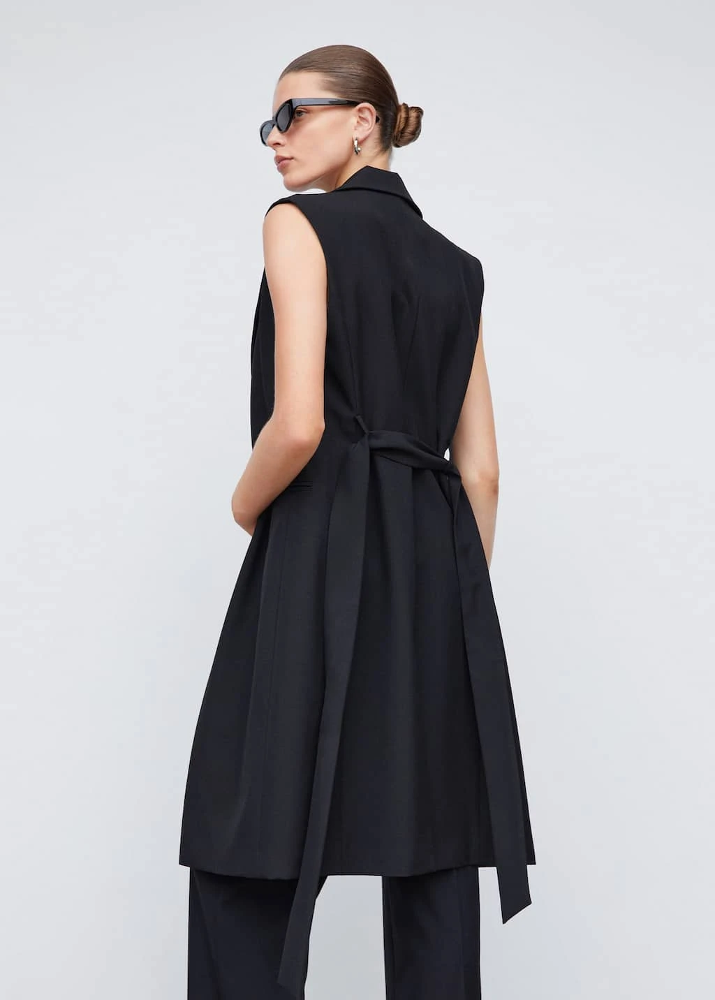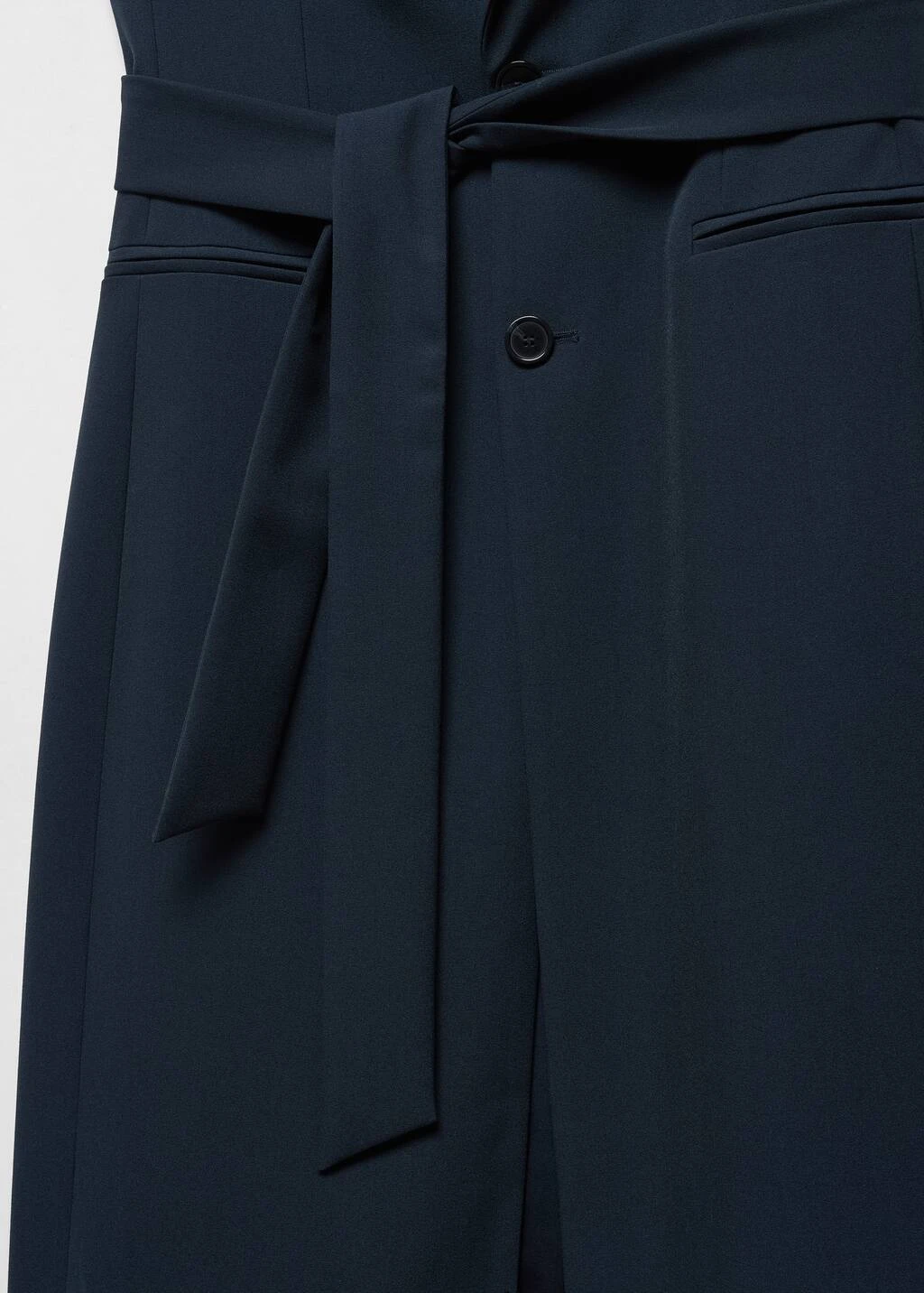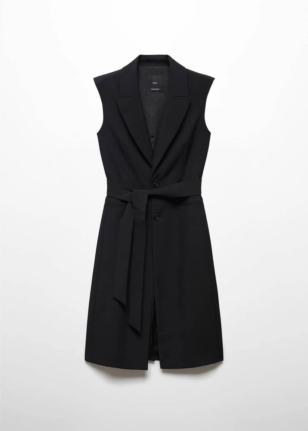 tissu fluide, droit, coupe longue, col en v avec rabat, sans manches, deux poches passepoilees a l’avant, fermeture boutonnee sur le devant, nœud a la taille, doublure, total lookComposition: 80% polyester,16% viscose,4% elasthanne. Doublure: 100% polyester. Ceinture: 80% polyester,16% viscose,4% elasthanne