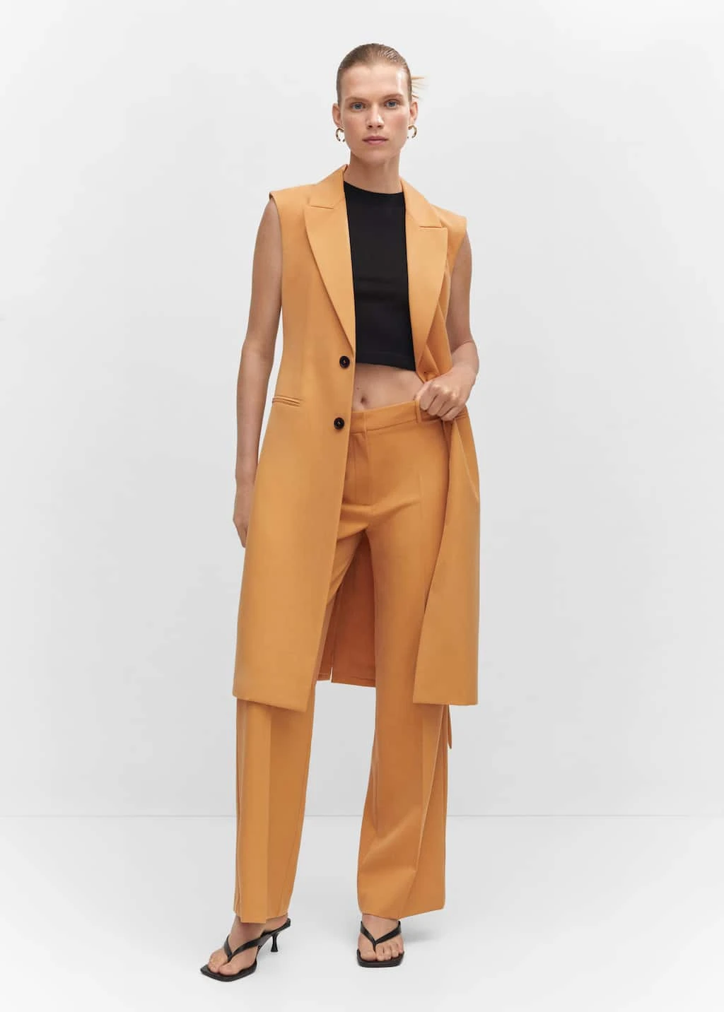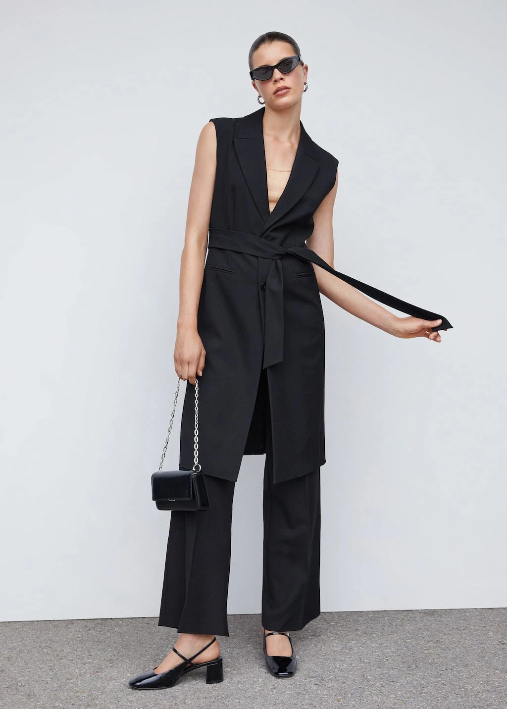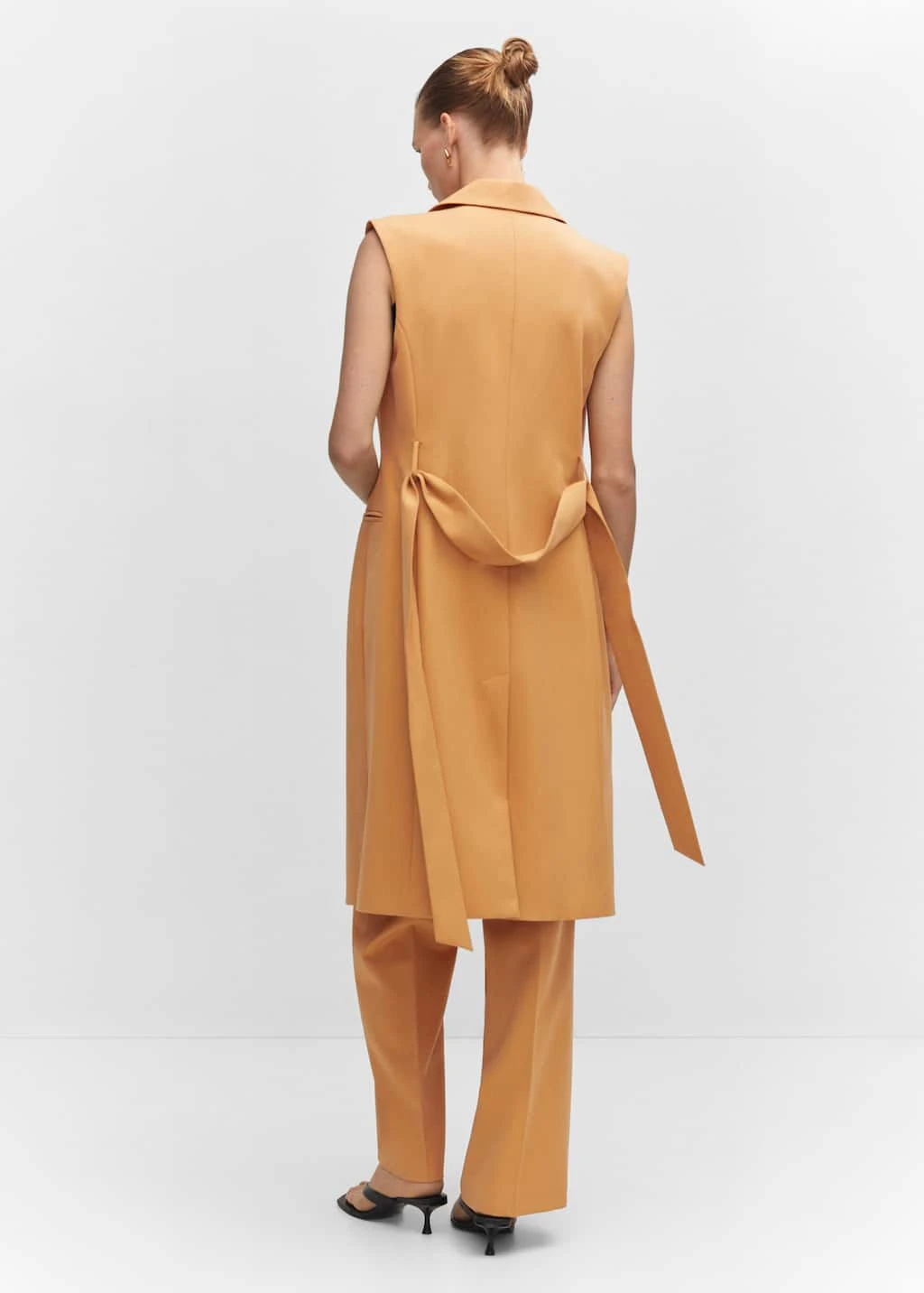 tissu fluide, droit, coupe longue, col en v avec rabat, sans manches, deux poches passepoilees a l’avant, fermeture boutonnee sur le devant, nœud a la taille, doublure, total lookComposition: 80% polyester,16% viscose,4% elasthanne. Doublure: 100% polyester. Ceinture: 80% polyester,16% viscose,4% elasthanne