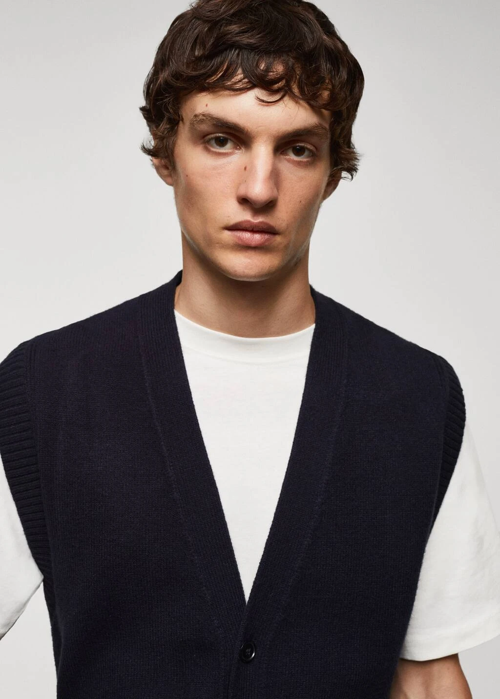 regular-fit, tissu de laine melange, tissu en grosse maille, fermeture a boutons sur le devant, sans manches, bas droit, le mannequin mesure 190 cm et porte une taille mComposition: 52% acrylique,25% polyester,14% polyamide,5% viscose,4% laine