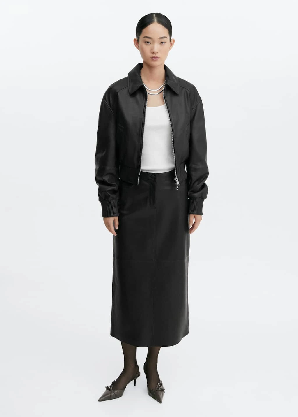 collection selection, 100 % cuir ovin, coupe midi, coupe droite, deux poches laterales, deux poches plaquees a l’arriere, fermeture eclair avec bouton, passants de ceinture , bas fendu a l’arriere, coutures decoratives, doublure, total look, une selection de pieces qui vous accompagneront lors du retour au bureau. confectionnee avec des matieres de qualite pour creer une garde-robe feminine et contemporaine pour votre quotidien.