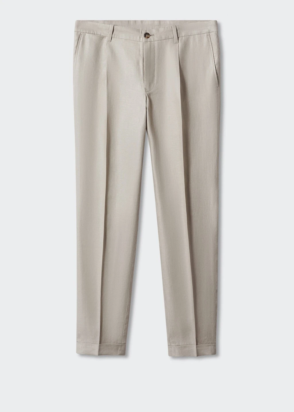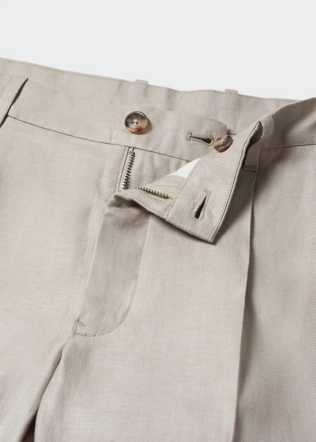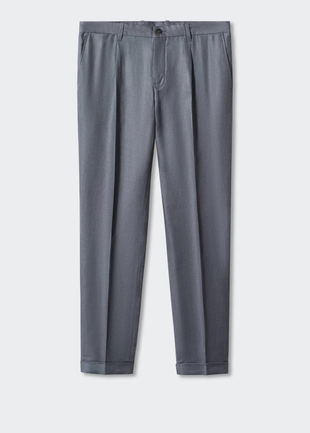 tissu 100 % lin, regular-fit, pinces sur le devant et a l’arriere, double bouton et fermeture eclair, deux poches avant, deux poches passepoilees boutonnees a l’arriere, revers, le mannequin mesure 190 cm et porte une taille 42Composition: 100% lin. Doublure poches: 65% polyester,35% coton