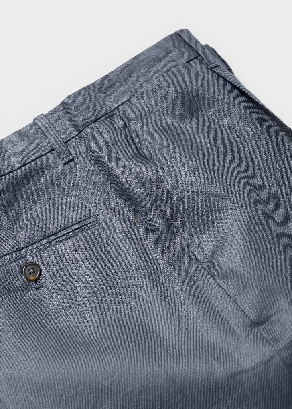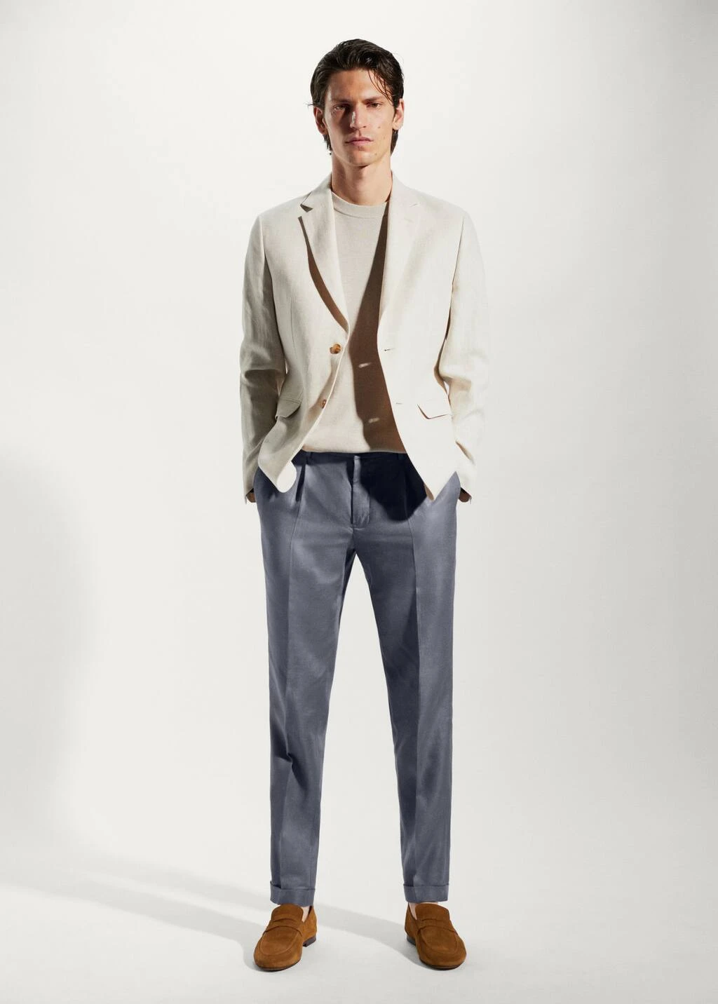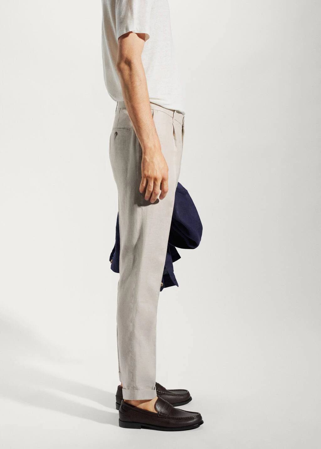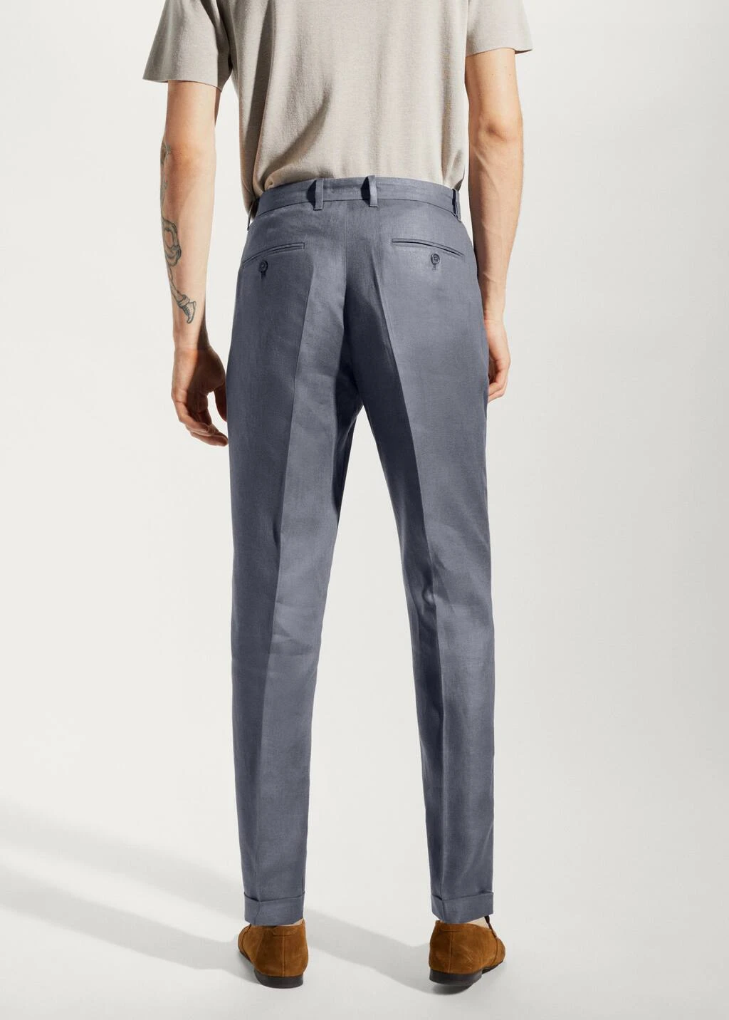 tissu 100 % lin, regular-fit, pinces sur le devant et a l’arriere, double bouton et fermeture eclair, deux poches avant, deux poches passepoilees boutonnees a l’arriere, revers, le mannequin mesure 190 cm et porte une taille 42Composition: 100% lin. Doublure poches: 65% polyester,35% coton