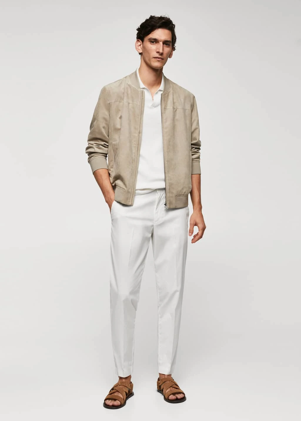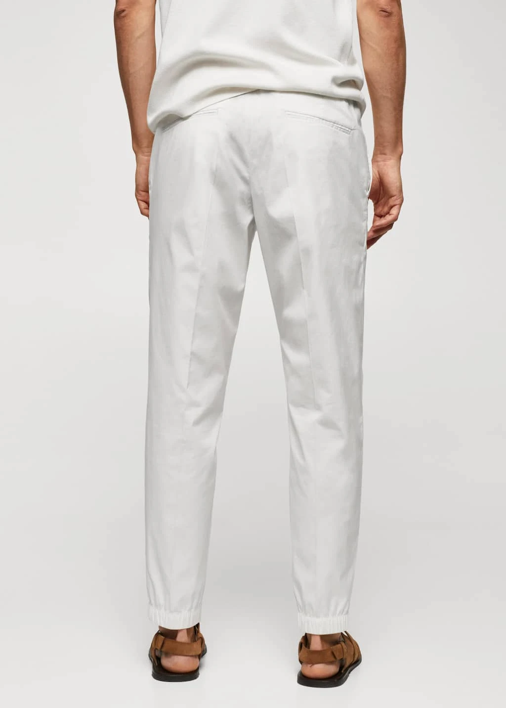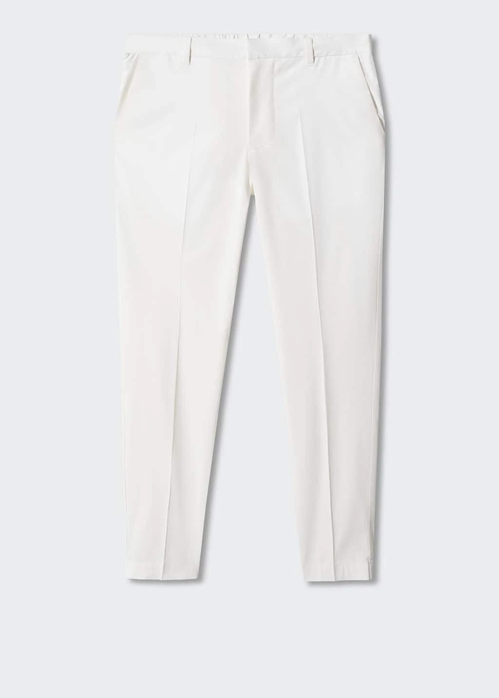 tissu en coton, slim-fit, coupe standard, fermeture eclair avec crochet et bouton dissimules, passants de ceinture , pinces sur le devant et a l’arriere, deux poches avant, deux poches passepoilees a l’arriere, bas elastique a l’arriere, le mannequin mesure 190 cm et porte une taille 42Composition: 96% coton,4% elasthanne. Doublure poches: 100% coton