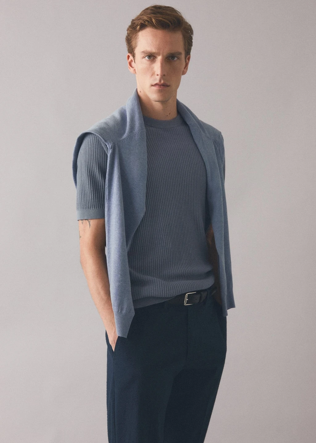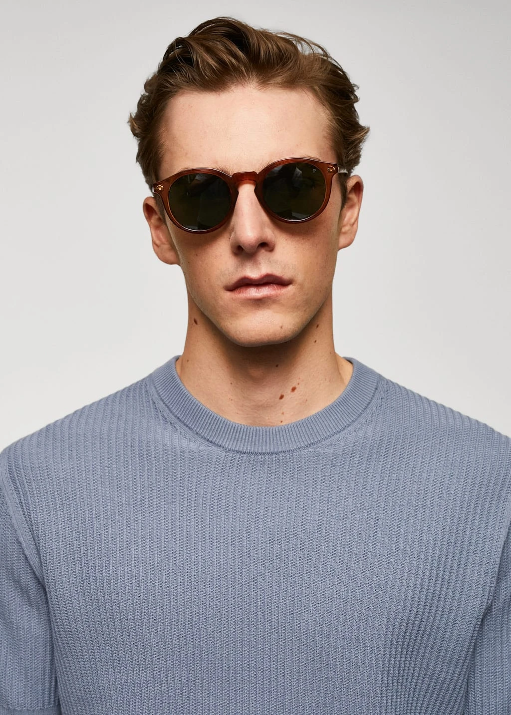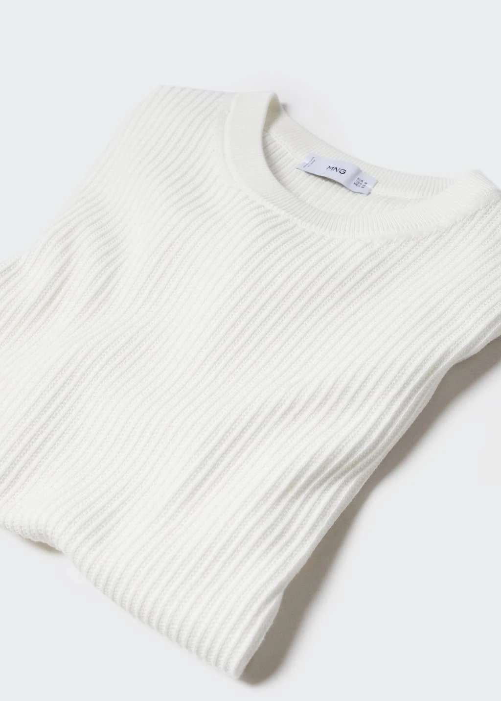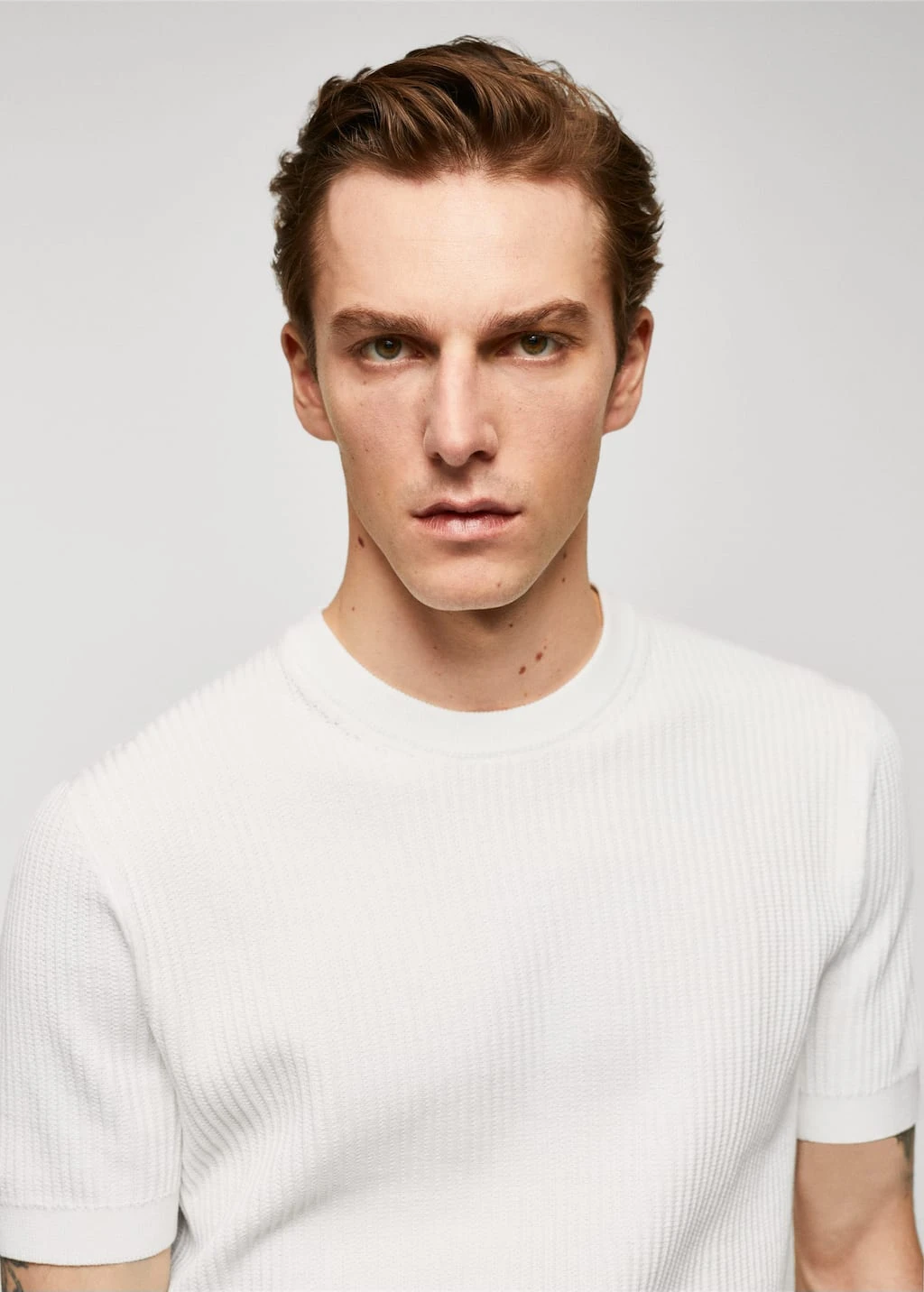 100 % coton, coupe droite, regular-fit, structure tressee en forme de maille cotelee, tissu en maille fine, col rond, manches courtes, bords coteles elastiques, le mannequin mesure 190 cm et porte une taille mComposition: 100% coton