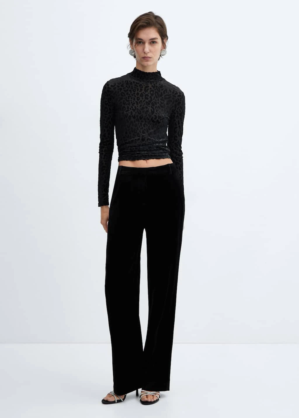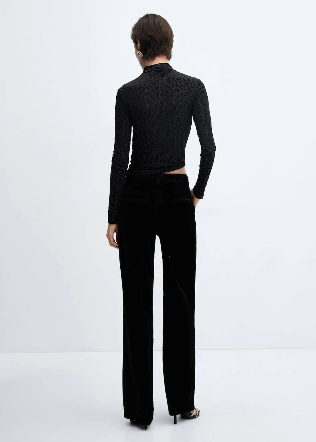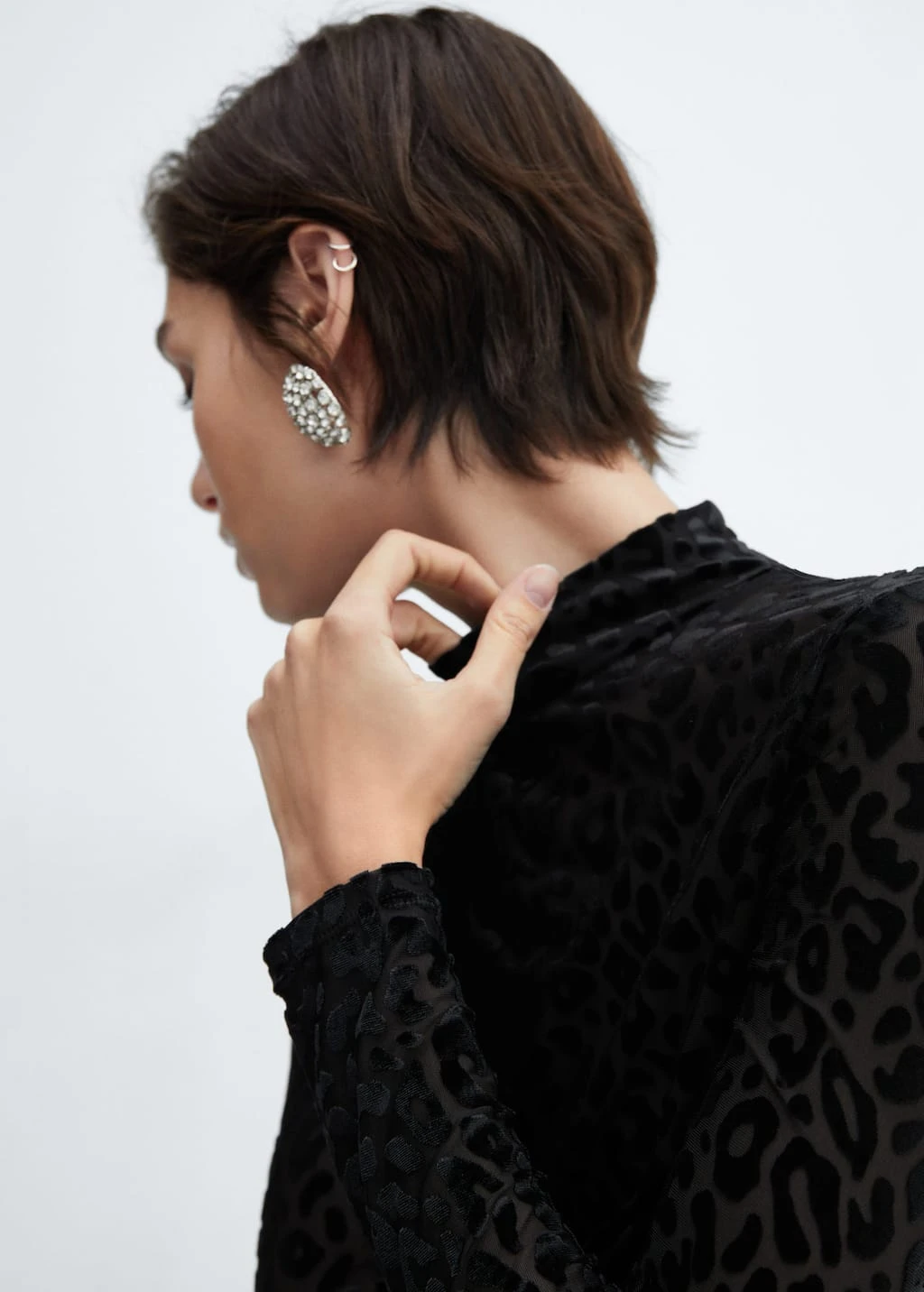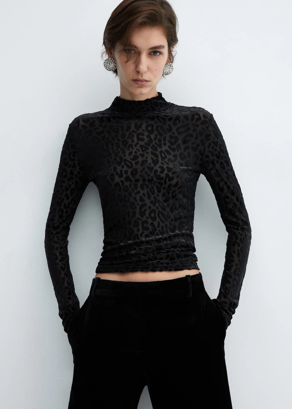 tissu en velours, tissu elastique, modele semi-transparent, ajuste, imprime animal, col montant, manches longues, collection fetes et ceremonies.Composition: 49% polyester,40% polyamide,11% elasthanne
