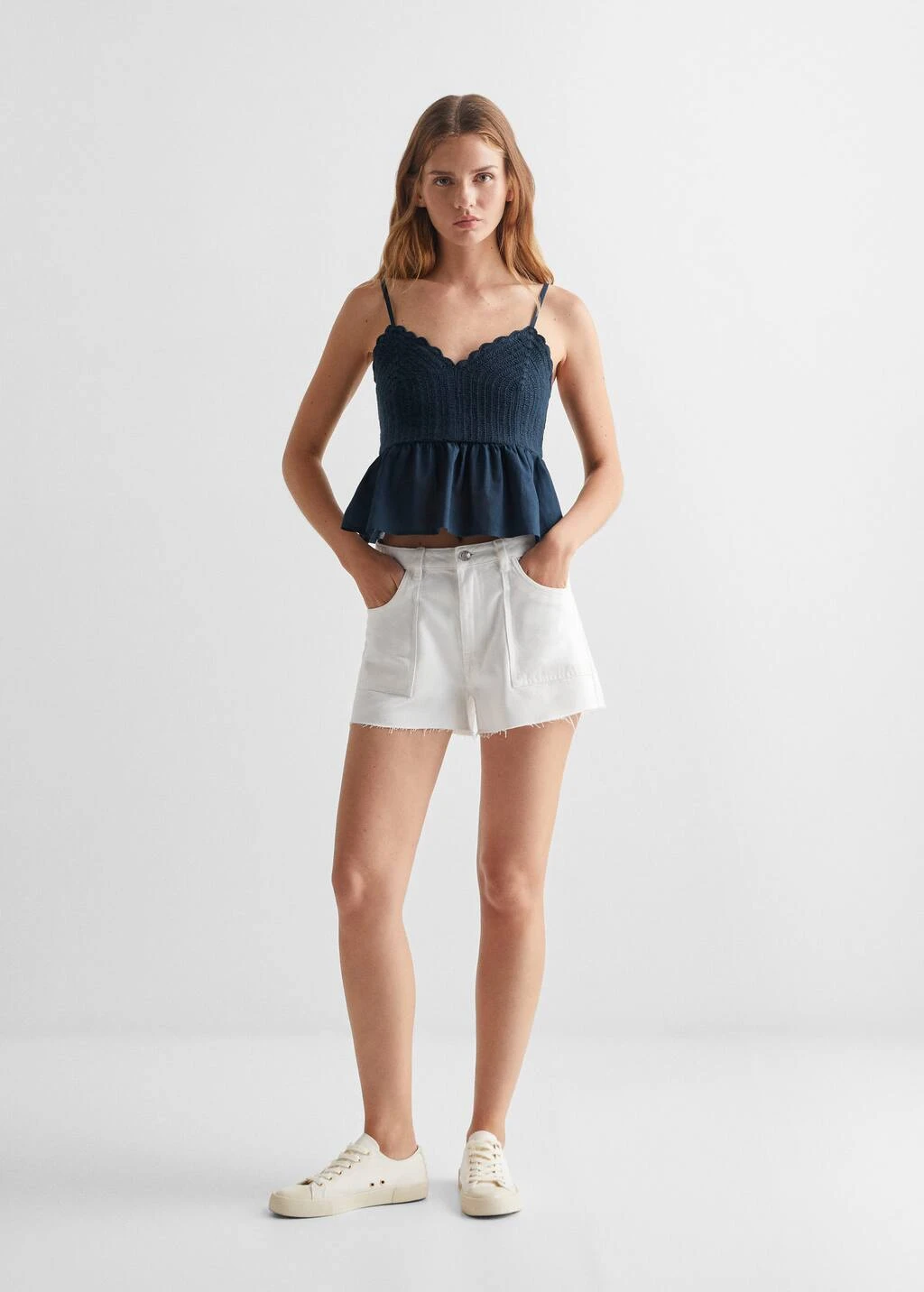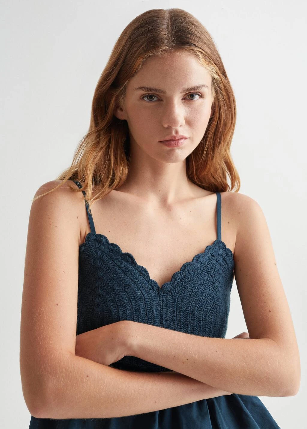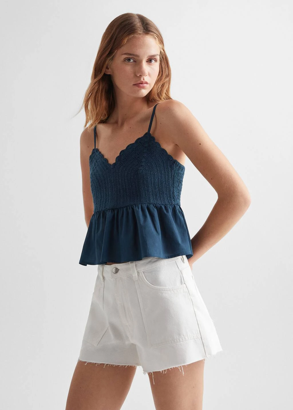 100 % coton, maille cotelee, style crop, bretelles fines, bretelles ajustables, col en v, sans manches, sans fermeture, le mannequin mesure 172 cm et porte une taille mComposition: 100% coton