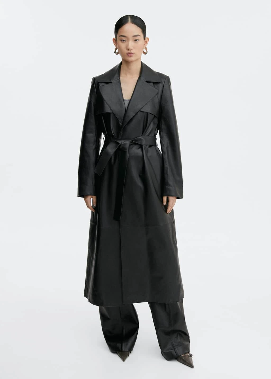 collection selection, tissus et confection de qualite superieure, 100 % cuir ovin, structure, coupe longue, croise, col a revers, manches longues, deux poches laterales, fermeture boutonnee sur le devant, fermeture a nouer, passants pour la ceinture, ouverture a l’arriere, doublure, une selection de pieces qui vous accompagneront lors du retour au bureau. confectionnee avec des matieres de qualite pour creer une garde-robe feminine et contemporaine pour votre quotidien.
