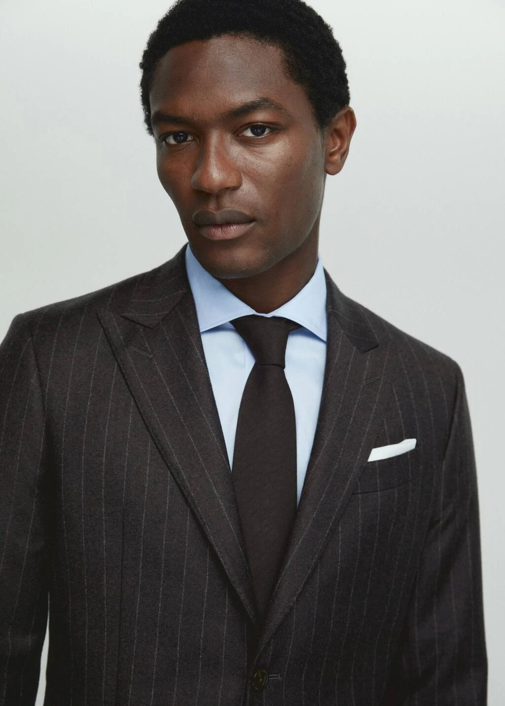 slim-fit, imprime fines rayures, col a revers larges, fermeture a boutons sur le devant, poche passepoilee sur la poitrine, poche ticket, deux poches a rabat sur les cotes, manches longues avec poignets boutonnes, double ouverture au dos, doublure, poche interieure, le mannequin mesure 190 cm et porte une taille 50.Composition: 100% laine vierge. Doublure: 52% viscose,48% polyester