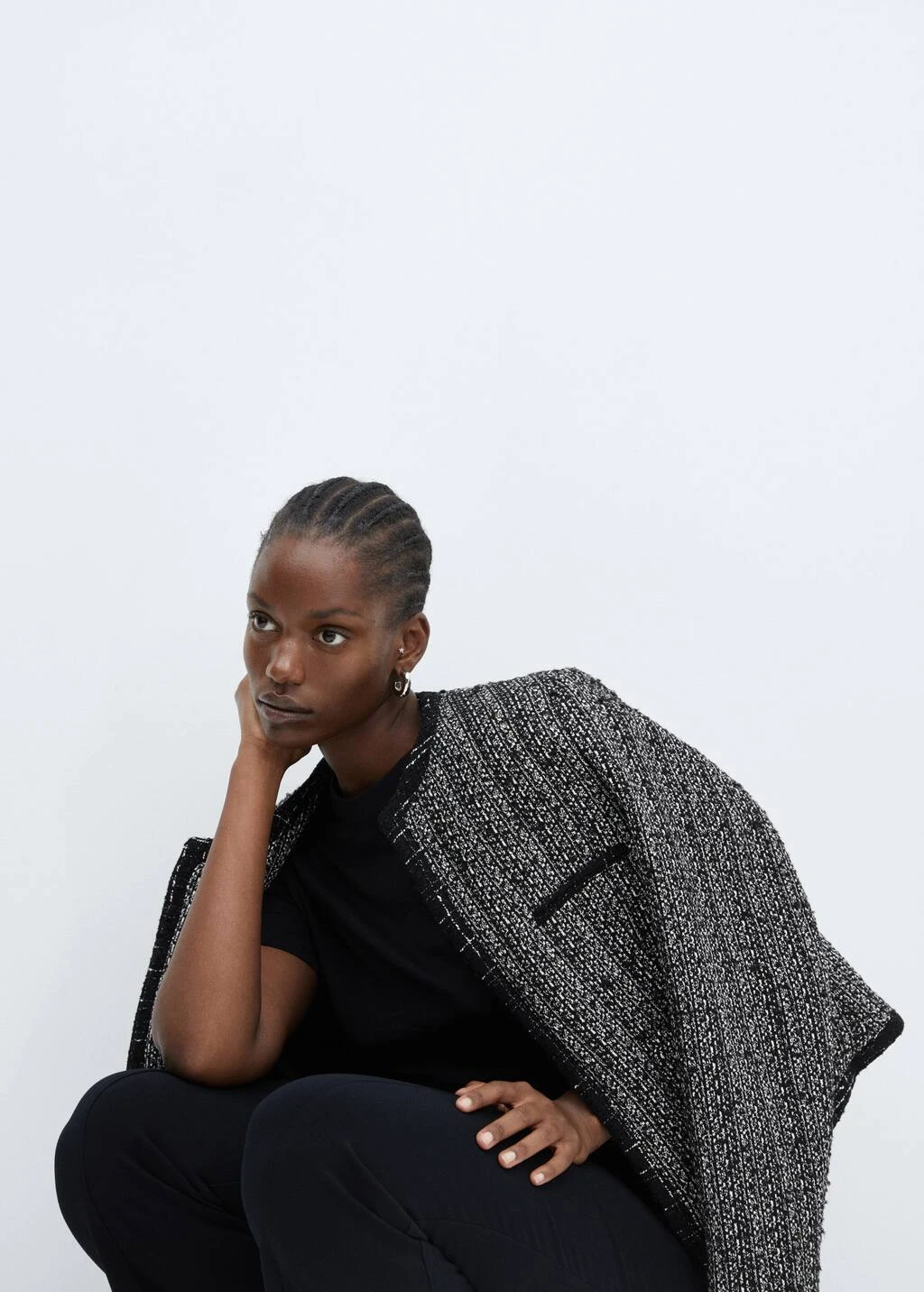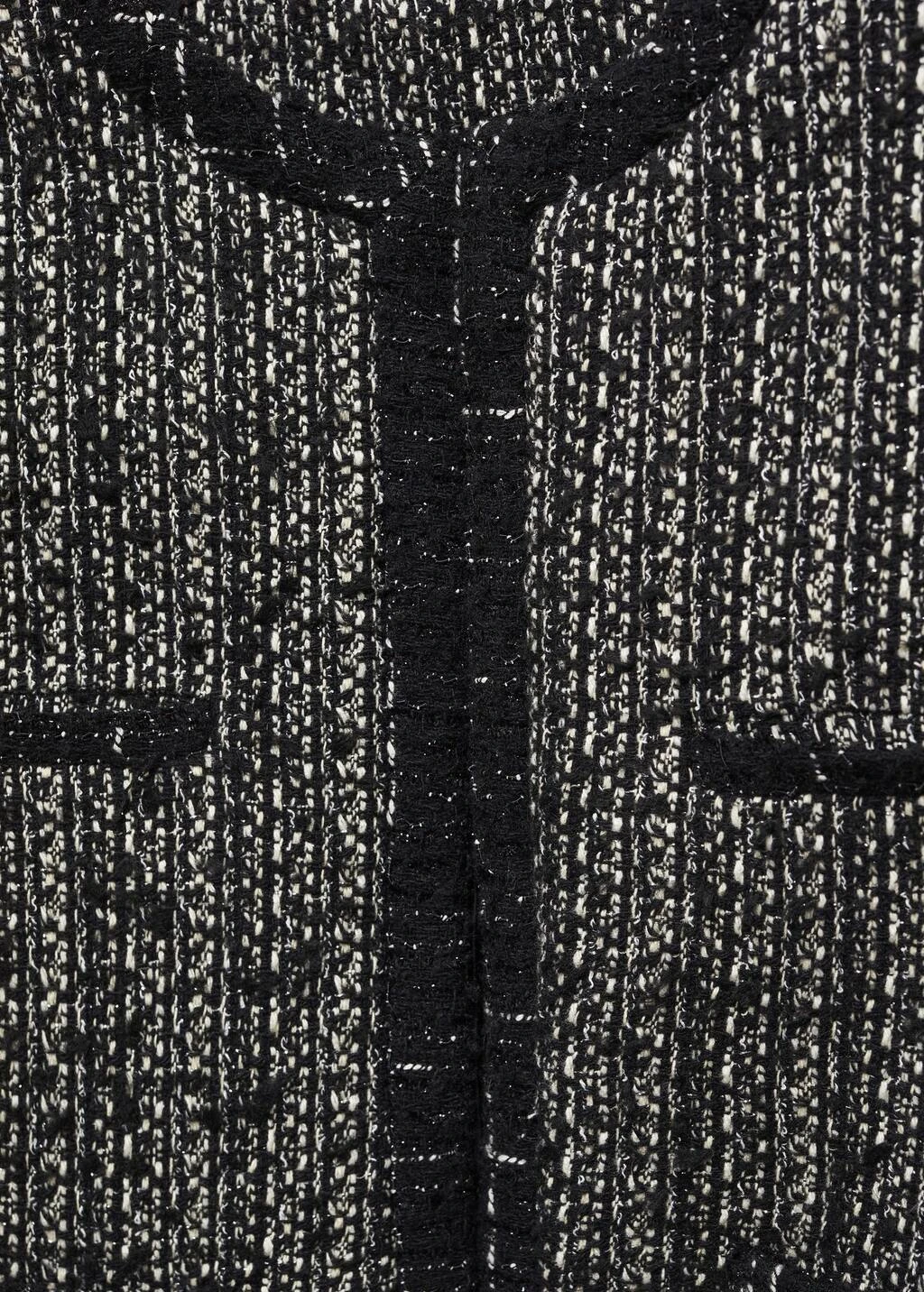 tissu en coton et laine melanges, tissu tweed, coupe courte, coupe droite, col rond, manches longues, deux poches passepoilees a l’avant, deux poches plaquees sur le devant, sans fermeture, liseres contrastants, doublure.Composition: 45% coton,27% acrylique,19% polyester,6% laine,3% polyamide. Doublure: 52% viscose,48% polyester. Applique: 31% acrylique,21% polyester,18% coton,14% polyamide,13% laine,3% viscose